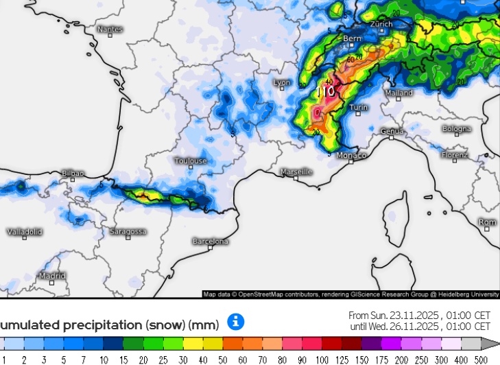The rain/snow limit will be highly variable, starting quite low and remaining very low for some time in the internal valley of the western Alps (e.g Haute-Tarentaise, Aosta, Valais) where the cold